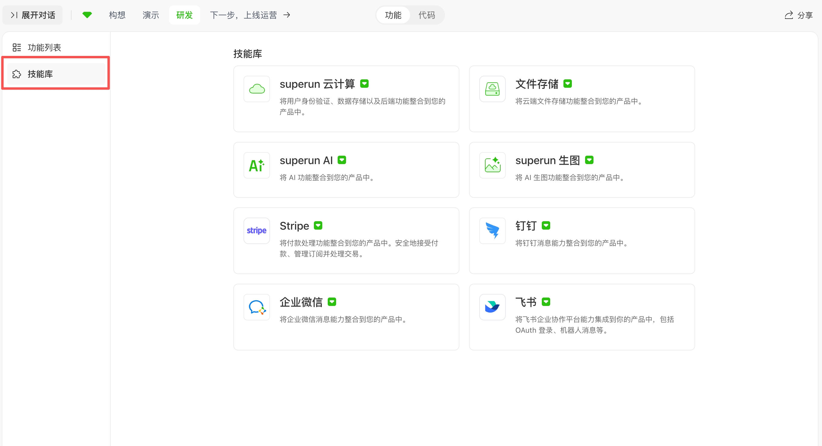 您可以从项目设置中的 研发 → 技能库 → superun 文件存储 访问 superun 文件存储.