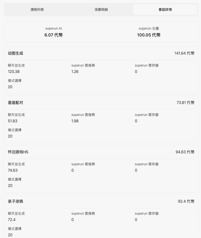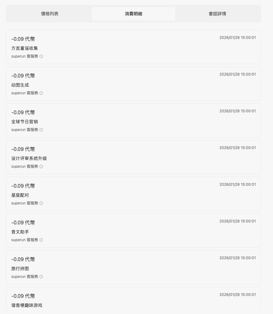- 使用明細:查看 Credits 在不同功能中的消耗情況(包含外掛,例如 superun 雲服務,superun AI,Stripe,superun 生圖 等)