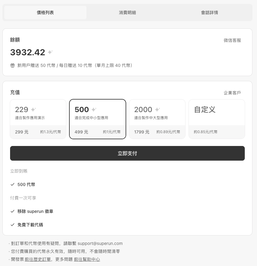 superun 採用 簡單的代幣制定價模型(Credits).你可以根據實際需求選擇合適的代幣充值方案,所有充值代幣永久有效,隨時可用,不會隨時間清零.代幣充值方案